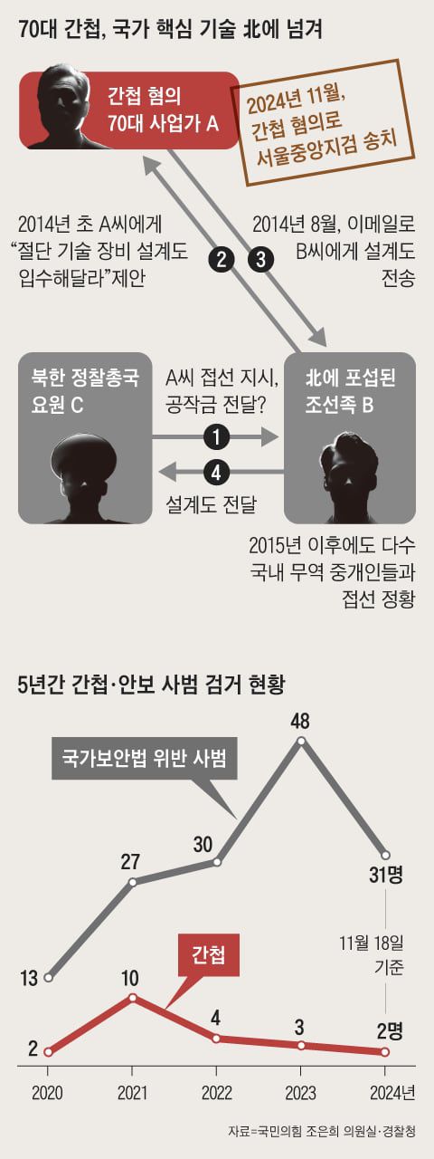 27일 사정 당국에 따르면, 서울경찰청 안보수사부는 2014년 8월부터 국가 핵심 기술 장비 설계도를 빼돌려 이메일로 북한 공작원에게 보낸 혐의(국가보안법 위반)로 70대 사업가 A씨를 서울중앙지검에 최근 불구속 송치했다. 국가 핵심 기술은 반도체·자동차·이차전지 등 국내 주력 산업과 관련해 기술적·경제적 가치가 높아 국외로 유출되면 국가 안보와 국민 경제에 큰 영향을 끼치는 기술을 가리킨다. 이번 A씨 사례는 경찰청이 올해 국정원의 대공 수사권을 전면 인수한 뒤 첫 간첩 수사의 성과이기도 하다.