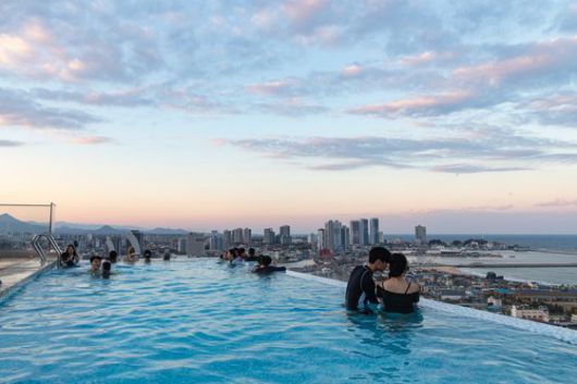 카시아 속초와 같은 반얀그룹 소속인 ‘홈마리나 속초(4성급)’도 지난 6월 개장했다. 청초호 인근에 자리한 홈마리나는 오후 11시까지 운영하는 루프톱 온수 수영장으로 인기를 끌고 있다. 인피니티 풀 옆에 자리한 바 ‘스카이21’에서 칵테일 마시며 호수와 바다, 도심의 불빛이 어우러진 야경을 감상하고 있으면 동남아 어느 항구 도시에 온 듯한 기분이 든다. 그래서일까. 속초에 흔한 온천 호텔과 달리 인증사진 촬영에 진심인 MZ세대가 유난히 많이 눈에 띄었다.