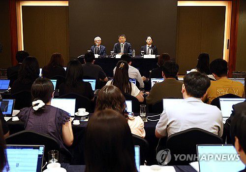 김광일 MBK파트너스 부회장(가운데)이 9월 19일 오전 서울 중구 롯데호텔에서 열린 MBK파트너스 고려아연 공개매수 관련 기자간담회에서 취재진의 질문에 답하고 있다. 왼쪽은 강성두 영풍 사장, 오른쪽은 이성훈 베이커매킨지코리아 변호사. [연합뉴스 자료사진] |