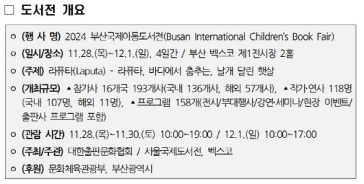 문체부는 부산시와 도서전을 지원하고 한국 아동도서 수출을 돕는다. 용호성 문체부 제1차관은 첫날 열리는 개막식에 참석해 관계자들을 격려할 예정이다.