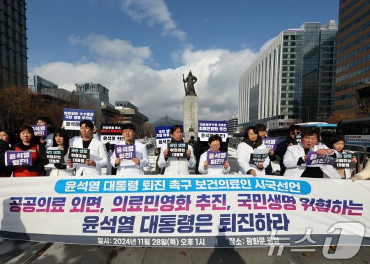 (서울=뉴스1) 황기선 기자 = 보건의료인들이 28일 오후 서울 광화문 광장에서 윤석열 대통령 퇴진 촉구 시국선언을 하고 있다. 이날 기자회견에서 간호사, 약사, 의사, 치과의사, 한의사 등 1054명의 보건의료인들은 의료민영화를 추진하고, 공공의료를 외면하며, 국민 생명을 위협하는 윤석열 정부의 퇴진을 촉구했다. 2024.11.28/뉴스1