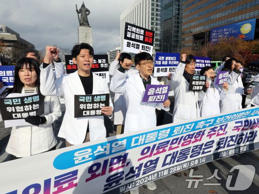 (서울=뉴스1) 황기선 기자 = 보건의료인들이 28일 오후 서울 광화문 광장에서 윤석열 대통령 퇴진 촉구 시국선언을 하고 있다. 이날 기자회견에서 간호사, 약사, 의사, 치과의사, 한의사 등 1054명의 보건의료인들은 의료민영화를 추진하고, 공공의료를 외면하며, 국민 생명을 위협하는 윤석열 정부의 퇴진을 촉구했다. 2024.11.28/뉴스1