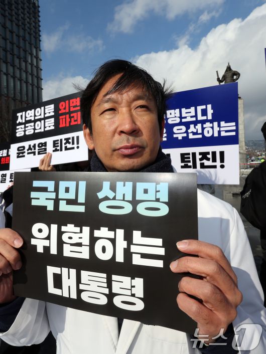 (서울=뉴스1) 황기선 기자 = 보건의료인들이 28일 오후 서울 광화문 광장에서 윤석열 대통령 퇴진 촉구 시국선언을 하고 있다. 이날 기자회견에서 간호사, 약사, 의사, 치과의사, 한의사 등 1054명의 보건의료인들은 의료민영화를 추진하고, 공공의료를 외면하며, 국민 생명을 위협하는 윤석열 정부의 퇴진을 촉구했다. 2024.11.28/뉴스1