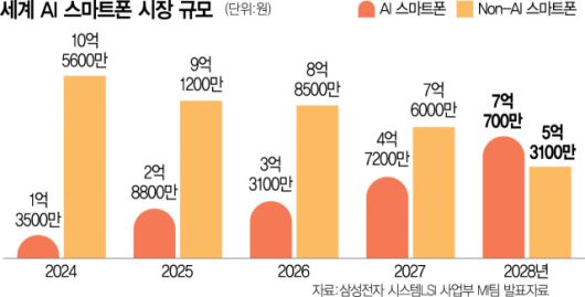 서울경제신문이 입수한 이날 삼성의 발표 자료에 따르면 올해 1억 3500만 대에 불과했던 AI 스마트폰 시장 규모는 2028년이 되면 7억 700만 대로 늘어날 것으로 전망된다.