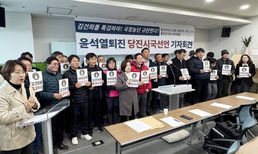 윤석열 퇴진 당진운동본부는 28일 충남 당진시청 브리핑룸에서 기자회견을 열어 “윤석열 대통령은 권력을 사유화해 대한민국의 헌정 질서와 민주주의가 무너지고 국민을 심각한 위기로 내몰고 있다”며 “윤석열 정권은 즉각 퇴진하라”고 밝혔다. 이 단체는 당진시 시민·사회·노동단체와 정당 등 16개 곳이 꾸렸다.