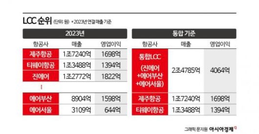 국내 저비용항공사(LCC) 업계가 대한항공과 아시아나항공 합병으로 지각변동을 맞이하게 됐다. 양사 계열사인 진에어와 에어서울, 에어부산도 통합되면서 단숨에 1위로 등극하게 된 것이다. 기존 1위인 제주항공을 비롯해 남은 항공사들은 생존을 위해 합종연횡을 벌일 수 있다는 전망이 나온다.