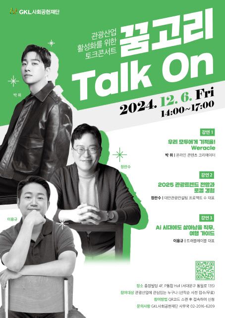 [이데일리 김명상 기자] GKL사회공헌재단은 12월 6일 서울 서대문 충정빌딩 4층 P통합Hall에서 관광 전공 대학(원)생과 관광업계 종사자를 대상으로 한 토크콘서트 ‘꿈고리 토크온(Talk on)’을 개최한다고 밝혔다.