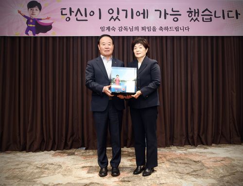 kt스포츠는 29일 오전 경기도 수원 이비스앰배서더 호텔에서 임계숙 kt 여자하키 감독 퇴임식을 열고 1986년 kt 입사해 선수 및 지도자, 직원으로 헌신한 임 감독의 노고를 격려했다.