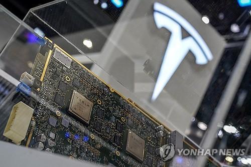 태국 방콕 엑스포에 전시된 테슬라의 FSD 소프트웨어 칩과 테슬라 로고 |