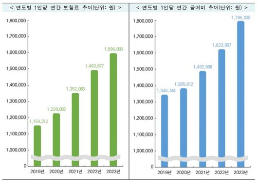 건강보험 세대당 월평균 보험료는 13만4010원으로, 직장가입자는 15만5760원, 지역가입자는 8만7579원이다. 건강보험 적용 대상자 1인당 연간 보험료는 159만6983원, 1인당 연간 급여비는 179만6030원으로 집계됐다.