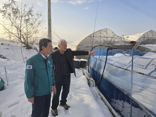 윤해진 농협생명 대표(왼쪽)는 이용학 수원지구원예농협 조합장(오른쪽)과 함께 폭설 피해를 입은 시설하우스를 직접 방문해 상황을 점검하고 대책마련을 논의했다. (사진=NH농협생명) |