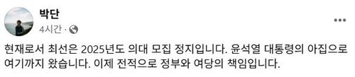 대한의사협회(의협) 비상대책위원회 일원이자 전공의 대표 격인 박단 대한전공의협의회(대전협) 비대위원장은 협의체 가동 중단 직후 페이스북에 글을 올려 "현재로서 최선은 2025년도 의대 모집 정지"라고 기존 입장을 재차 언급했다.