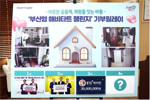 (부산=연합뉴스) 조정호 기자 = 부산시는 방탄소년단 지민이 지난 29일 취약 어르신의 주거 공간을 개선하는 '부산형 해비타트 챌린지'에 사용해달라며 3천만원을 전달했다고 2일 밝혔다.