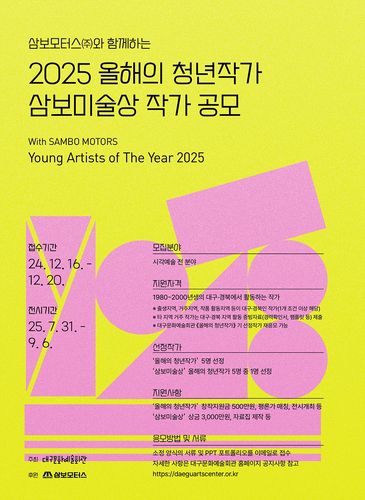 (대구=연합뉴스) 한무선 기자 = 대구문화예술회관은 오는 16일부터 20일까지 '2025 올해의 청년작가'와 '삼보미술상 작가'를 모집한다고 2일 밝혔다.