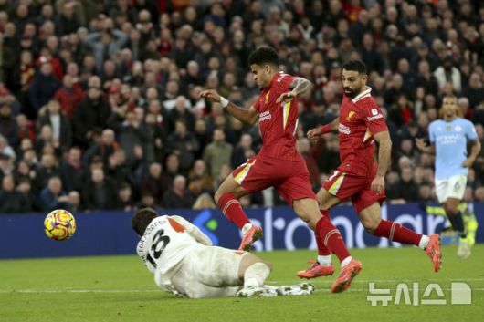 [리버풀=AP/뉴시스] 리버풀의 코디 학포(가운데)가 1일(현지시각) 영국 리버풀의 안필드 스타디움에서 열린 2024-25 프리미어리그(PL) 13라운드 맨체스터 시티와 경기 후반 30분 맨시티 골키퍼 스테판 오르테가로부터 페널티킥(PK)을 얻어내고 있다. 이 PK는 모하메드 살라가 차 넣어 팀의 두 번째 득점이 됐다. 리버풀이 2-0으로 완승하고 11승1무1패(승점34)로 1위를 유지했다. 2024.12.02.