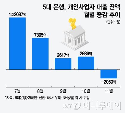 5대은행, 개인사업자 대출 잔액 월별 증감 추이/그래픽=윤선정 |