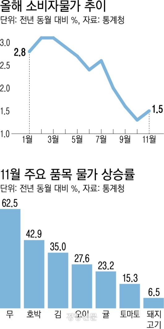 채소류 물가가 9월(11.5%)과 10월(15.6%)에 이어 지난달에도 10%를 상회(10.4%, 물가 기여도 0.15%포인트)하며 고공행진했다. 품목별로는 무(62.5%), 호박(42.9%), 김(35.0%), 오이(27.6%), 귤(23.2%) 등의 가격 상승이 두드러졌다. 농식품부 관계자는 “가격이 다소 높게 형성되고 있는 무는 월동무가 본격 출하되는 1월 이후에 공급 여건이 회복될 것으로 전망된다”고 말했다.