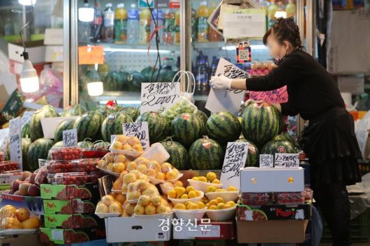 서울 관악구 신사시장에서 한 상인이 과일을 정리하고 있다. 한수빈 기자 |