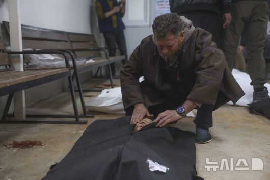 [마아라트 미스린=AP/뉴시스] 2일(현지시각) 시리아 이들리브주 마아라트 미스린의 한 병원에서 한 남성이 바닥에 놓인 아이의 시신을 어루만지며 오열하고 있다. 시리아인권관측소는 시리아와 러시아 전투기가 이들리브와 알레포 등 반군 점령 지역에 420차례의 공습을 가했다고 전했다. 2024.12.03.