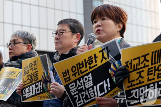 (서울=뉴스1) 이동해 기자 = 윤석열 대통령 퇴진 국민투표를 안내하고 참여를 독려한 혐의로 고발된 전희영 전국교직원노동조합(전교조) 위원장이 3일 오전 서울 마포구 서울경찰청 공공범죄수사대에서 소환 조사에 앞서 입장을 밝히고 있다. 2024.12.3/뉴스1