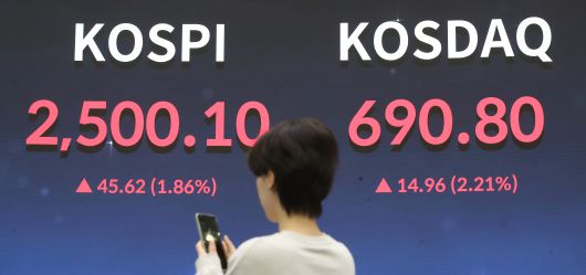 3일 한국거래소에 따르면 코스피지수는 전 거래일 대비 46.52포인트(1.86%) 오른 2500.10을 기록했다. 지수는 전날보다 17.58포인트(0.72%) 오른 2472.06에 출발해 장중 상승 폭을 확대했다.