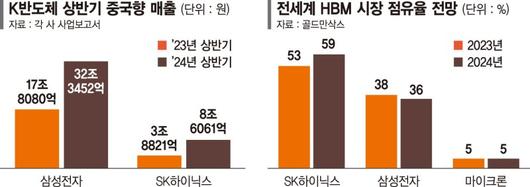 3일 반도체 업계에 따르면 미국 상무부가 사실상 HBM2부터 최신 제품인 HBM3E(5세대)를 제재대상 리스트에 올리면서 HBM 시장을 양분 중인 삼성전자와 SK하이닉스에 끼칠 영향에 관심이 쏠리고 있다. 미국의 추가 제재 가능성이 높아지자 중국 기업들이 K반도체 사재기에 나서면서 올해 양사의 중국을 대상으로 한 판매가 급증한 바 있다.