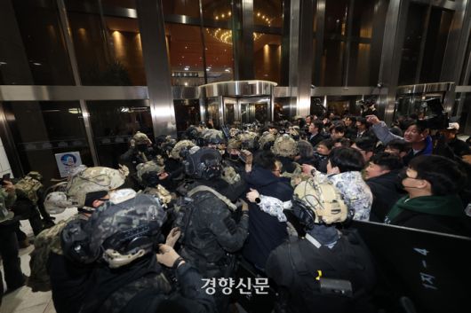 윤석열 대통령이 비상계엄을 선포한 이튿날인 4일 국회 본청 출입을 봉쇄하려는 계엄군과 당직자들이 몸싸움을 벌이고 있다. 성동훈 기자 |