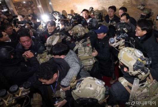 윤석열 대통령이 긴급 대국민 담화를 통해 비상계엄령을 발표한 가운데 4일 서울 여의도 국회 내부로 계엄군이 진입하자 보좌진들과 충돌하고 있다. 2024.12.04. /사진=조성봉 |