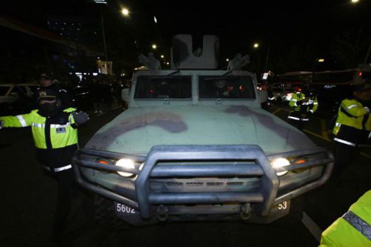 윤석열 대통령의 비상계엄 해제 요구 결의안이 국회 본회의에서 통과된 4일 새벽 계엄군이 국회 앞 도로를 빠져나가고 있다. 박시몬 기자 |