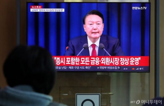 윤석열 대통령이 비상계엄 해제를 선언한 4일 오전 서울역 대합실에서 시민들이 관련 뉴스를 보고 있다. /사진=뉴시스 |