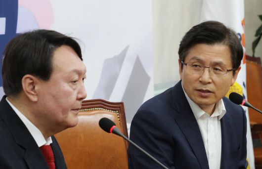 2019년 8월8일 윤석열 당시 검찰총장이 여의도 국회에서 황교안 당시 자유한국당 대표를 예방한 뒤 인사말을 하고 있다. 연합뉴스 |