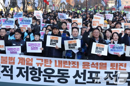 (서울=뉴스1) 신웅수 기자 = 민주노총을 비롯한 시민사회단체 회원들이 4일 오전 서울 광화문광장에서 윤석열 대통령의 불법 계엄을 규탄하고 있다. 민주노총은 윤석열 정권이 퇴진할때까지 무기한 총파업에 돌입한다고 밝혔다. 윤석열 대통령은 지난 3일 밤 44년 만의 계엄을 선포했지만 국회의 비상계엄 해제 요구 결의안이 가결되면서 6시간 만에 비상계엄은 해제됐다. 2024.12.4/뉴스1