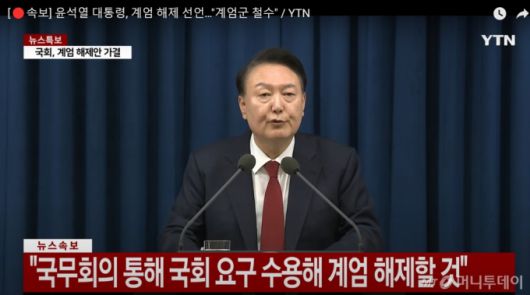(서울=뉴스1) = 윤석열 대통령이 4일 새벽 서울 용산 대통령실에서 담화를 통해 비상계엄 선포 해제를 발표하는 장면이 방송되고 있다. (YTN화면 캡쳐) 2024.12.4/뉴스1 Copyright (C) 뉴스1. All rights reserved. 무단 전재 및 재배포, AI학습 이용 금지. /사진=(서울=뉴스1) |
