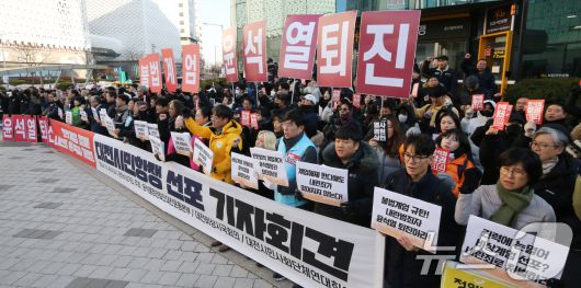 (대전=뉴스1) 김기태 기자 = 윤석열퇴진대전운동본부와 시민단체 구성원들이 4일 오전 대전 서구 은하수네거리에서 기자회견을 열고 윤석열 대통령 퇴진을 촉구하고 있다. 2024.12.4/뉴스1