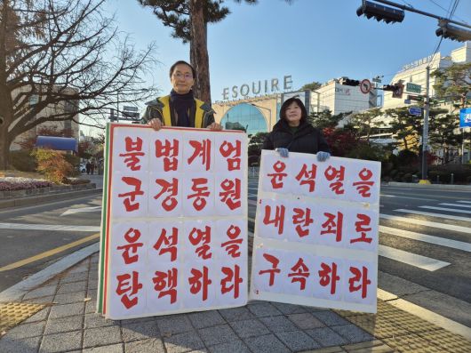 충북시민사회단체연대회의는 4일 아침 8시부터 충북 청주시 상당구 상당공원 앞 네거리에서 윤 대통령 탄핵과 구속을 촉구하는 손팻말 시위를 했다.