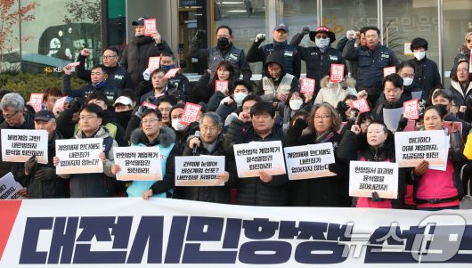 (대전=뉴스1) 김기태 기자 = 윤석열퇴진대전운동본부와 시민단체 구성원들이 4일 오전 대전 서구 은하수네거리에서 기자회견을 열고 윤석열 대통령 퇴진을 촉구하고 있다. 2024.12.4/뉴스1