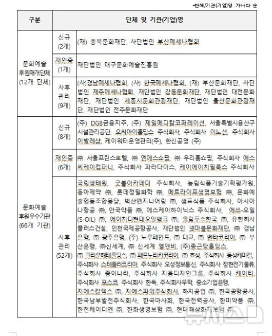 [서울=뉴시스] 문화예술후원 매개단체·우수단체 인증 현황. (표=문체부 제공) photo@newsis.com *재판매 및 DB 금지 |