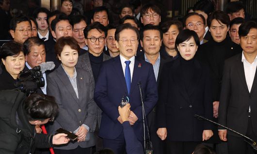 4일 새벽 서울 영등포구 여의도 국회에서 비상계엄 해제요구 결의안 통과 후 더불어민주당 이재명 대표가 입장을 밝히고 있다. 연합뉴스 |