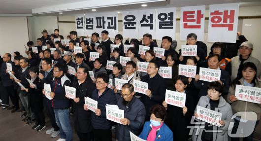 (부산=뉴스1) 윤일지 기자 = 민주노총 부산본부 노조, 부산시민사회, 제정당 대표들이 4일 오전 부산 동구 민주노총 부산지역본부에서 열린 윤석열 대통령의 비상계엄 선포와 관련 비상회의에 앞서 손피켓을 들고 입장문을 발표하고 있다. 2024.12.4/뉴스1