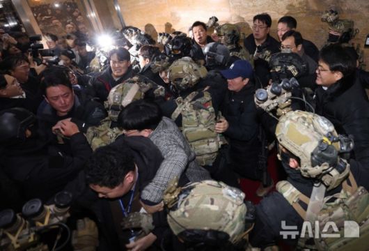 윤석열 대통령이 긴급 대국민 담화를 통해 비상계엄령을 발표한 가운데 4일 서울 여의도 국회 내부로 계엄군이 진입하자 보좌진들과 충돌하고 있다. 2024.12.04. /사진=뉴시스 |