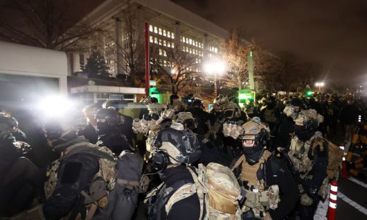 윤석열 대통령의 비상계엄 해제 요구 결의안이 국회 본회의에서 통과된 4일 새벽 무장 계엄군이 국회를 나서고 있다. 뉴스1 |
