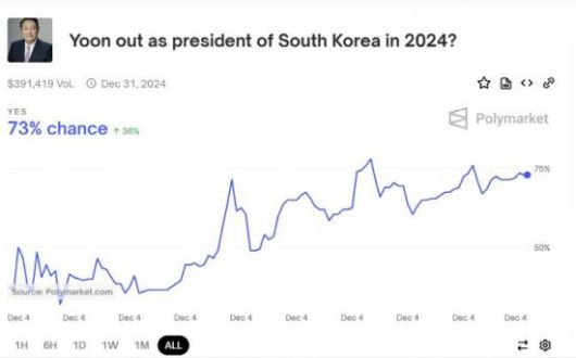 4일 오전 폴리마켓에는 이번 사태와 관련된 베팅이 약 7개 열렸다. 이 중 "윤 대통령이 2024년 한국 대통령직에서 물러날 것인가"라는 질문에는 약 39만1419달러(약 5억5440만원) 규모의 베팅이 이뤄졌으며 퇴진 가능성은 73%로 평가됐다.