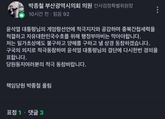 [이데일리 이재은 기자] 박종철 국민의힘 부산시의원이 윤석열 대통령의 비상계엄 선포에 대해 적극 지지한다는 글을 올려 논란이 되고 있다.