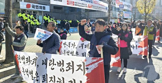 (대구=뉴스1) 남승렬 기자 = 민주노총 대구지역본부와 윤석열심판대구시국회의 등이 4일 오전 대구 수성구 범어동 국민의힘 대구시당 앞에서 전날 비상계엄을 선포한 윤석열 대통령 퇴진을 촉구하고 있다. 2024.12.4/뉴스1