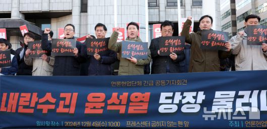 [서울=뉴시스]조수원 기자 = 윤석열 대통령의 비상계엄 선포 및 해제와 관련해 한국기자협회 등 9개 언론현업단체가 윤 대통령의 "즉각 퇴진 및 구속 수사를 촉구"한다고 4일 밝혔다.