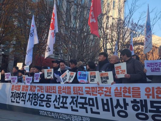[제주=뉴스핌] 문미선 기자 = 제주지역 노동시민사회단체가 4일 제주도청 앞에서 윤석열 대통령의 계엄선포를 규탄하며 즉각적인 퇴진을 요구하는 기자회견을 가졌다.