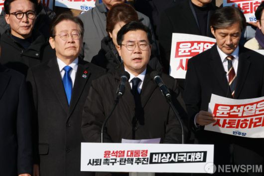 [서울=뉴스핌] 이형석 기자 = 박찬대 더불어민주당 원내대표가 4일 오후 서울 여의도 국회에서 열린 윤석열 대통령 사퇴촉구 탄핵추진 비상시국대회에서 규탄사를 하고 있다. 2024.12.04 leehs@newspim.com