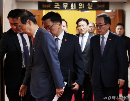 [서울=뉴시스] 김명원 기자 = 한덕수 국무총리가 4일 오전 서울 종로구 정부서울청사에서 윤석열 대통령이 긴급 담화로 비상계엄 해제를 선언 가운데 긴급 소집된 회의를 마친후 최상목 경제부총리 겸 기획재정부 장관, 이주호 사회부총리 겸 교육부 장관 및 국무위원들과 국무회의실을 나서고 있다. 2024.12.03. kmx1105@newsis.com /사진=김명원 |