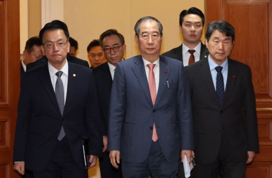 한덕수 국무총리가 4일 오전 서울 종로구 정부서울청사에서 윤석열 대통령이 긴급 담화로 비상계엄 해제를 선언 가운데 긴급 소집된 회의를 마친후 최상목 경제부총리 겸 기획재정부 장관, 이주호 사회부총리 겸 교육부 장관 및 국무위원들과 국무회의실을 나서고 있다. 뉴시스 |