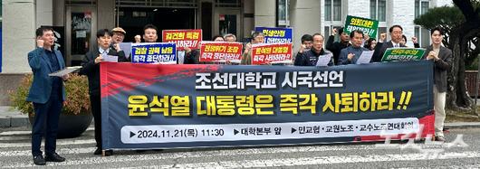 조선대 교직원들이 지난 11월 21일 오후 광주시 동구 조선대 본관 앞에서 윤석열 대통령 사퇴를 촉구하는 시국선언문을 발표하고 있다. 김한영 기자 |